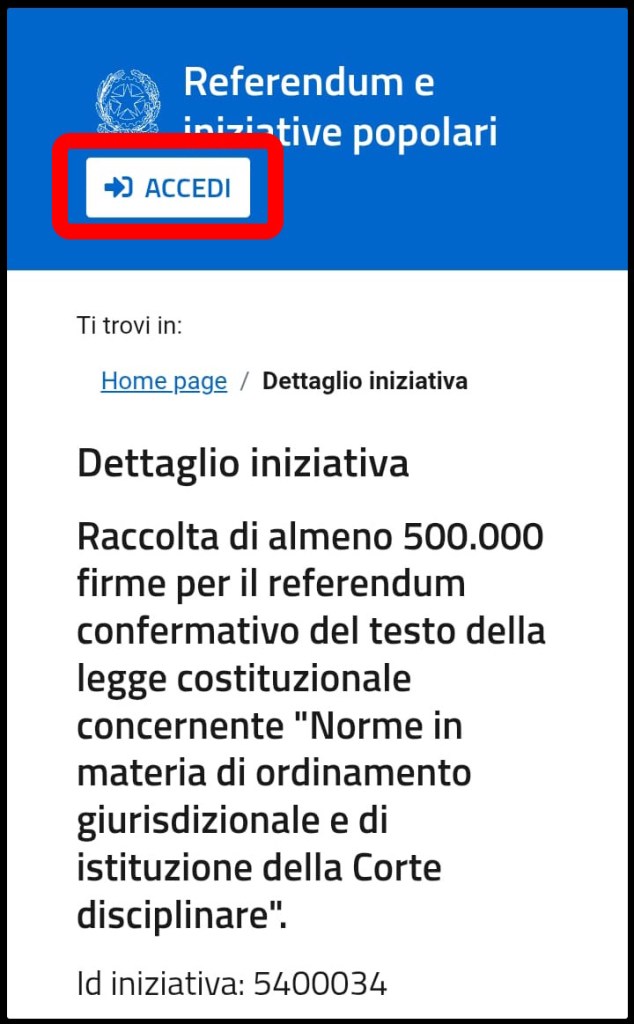 Dopo aver selezionato il link indicato qui sopra, entrerai nella pagina Referendum e iniziative popolari. Tocca (o clicca) il pulsante ACCEDI.