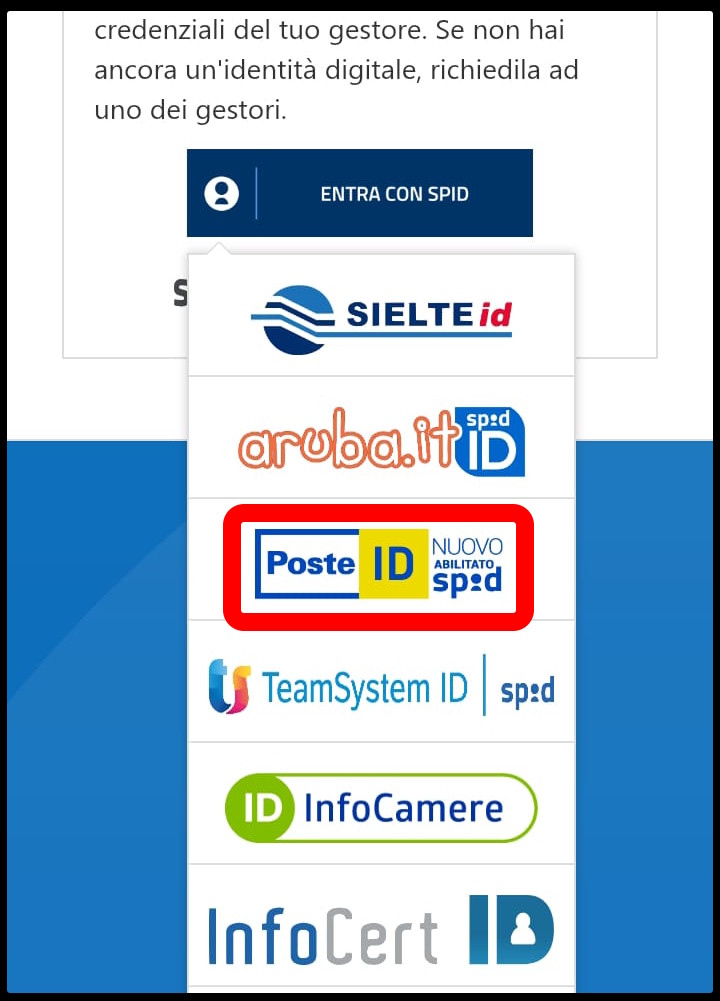 viene presentato un elenco nel quale devi selezionare il fornitore del servizio SPID che utilizzi. In questa guida viene mostrato l’accesso tramite Poste ID, lo SPID di Poste Italiane. Si tratta certamente del più comune, ma il tuo fornitore potrebbe essere diverso.
